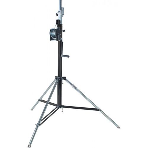 Supporto professionale per sistemi luce in acciaio tubolare zincato. Provvisto di una gamba livellante controllata da un dispositivo ergonomico in alluminio pressofuso, con scanalature antiscivolo (include un foro per cacciavite), per garantire la perfetta e costante verticalità del supporto in condizioni estreme. Dotato di un “argano a manovella” con freno automatico. Certificato GS TUV.