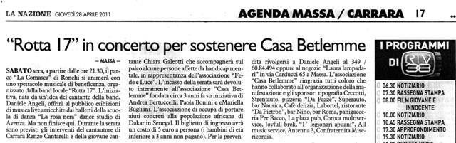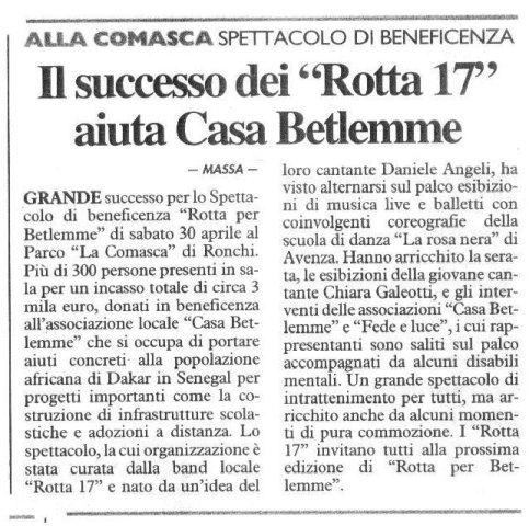 1a edizione dello Spettacolo di beneficenza organizzato dalla band in favore dell'Ass.ne CASA BETLEMME e svoltosi presso il Parco LA COMASCA dei Ronchi. Hanno partecipato: scuola di ballo LA ROSA NERA e la giovane cantante Chiara Galeotti.