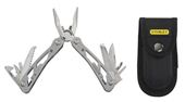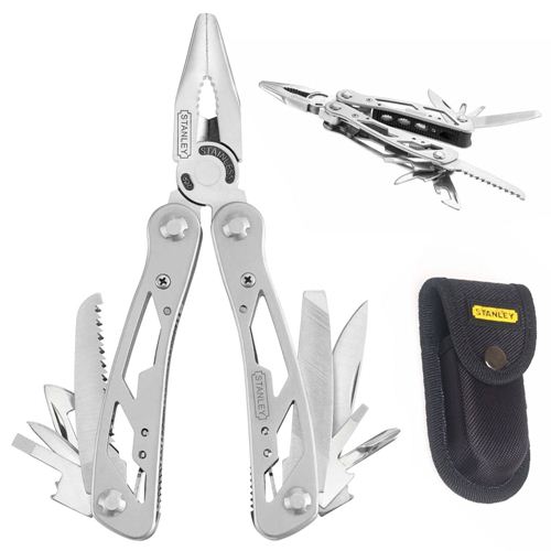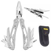 Pinza multiuso 12 in 1: pinza, tronchese, coltello liscio, seghetto a legno, lima, cacciavite a croce e a taglio, cacciavite a taglio piccolo, apriscatolette, punteruolo.